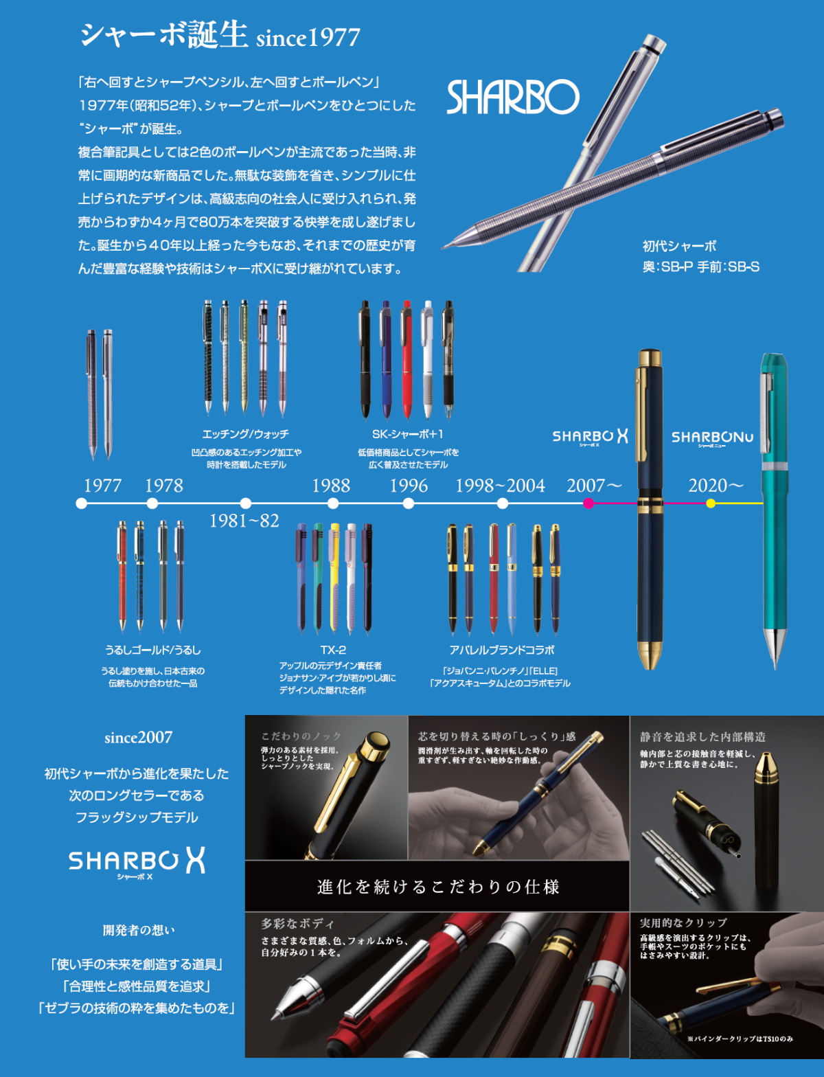 1977年に発売された画期的な多機能ペン、「右に回すとシャープペンシル。左に回すとボールペン。 1本で2本分」のCMキャッチフレーズで爆発的な人気となった大ヒット商品 ゼブラ「シャーボ」
