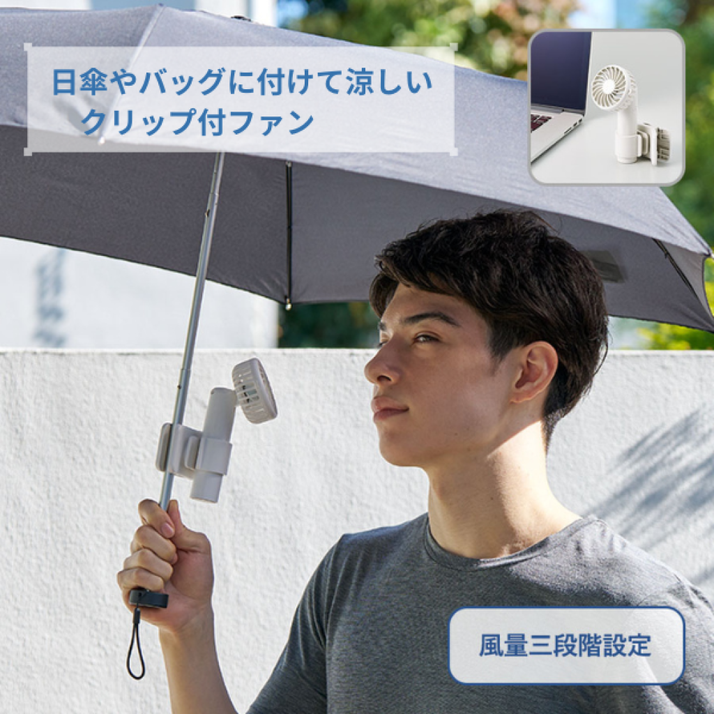 日傘にもつけられるクリップ付ハンディファン