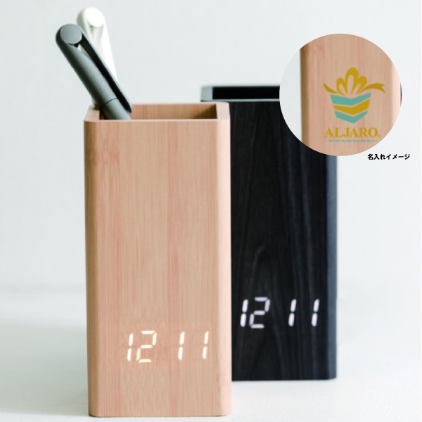 ペンスタンド機能の付いた、スタイリッシュな木製LEDクロック。