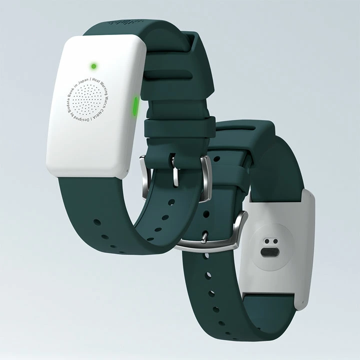 体調異変を検知し、熱中症リスクを音・光・振動でお知らせする、使い切りタイプのウェアラブルデバイスです。